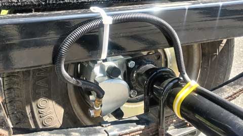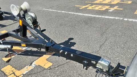 トレーラー前部の連結装置に、油圧慣性ブレーキシステムの構成部品となるアクチュエータ(油圧シリンダ)を取り付けました。