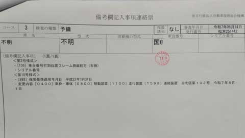 こちらの画像の書類(備考欄記入事項連絡票)は、車検証が発行される前のものです。
