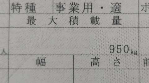 つまり、車両総重量 - 車両重量が、最大積載量となり、今回のケースでは950kg が最大積載量となりました。